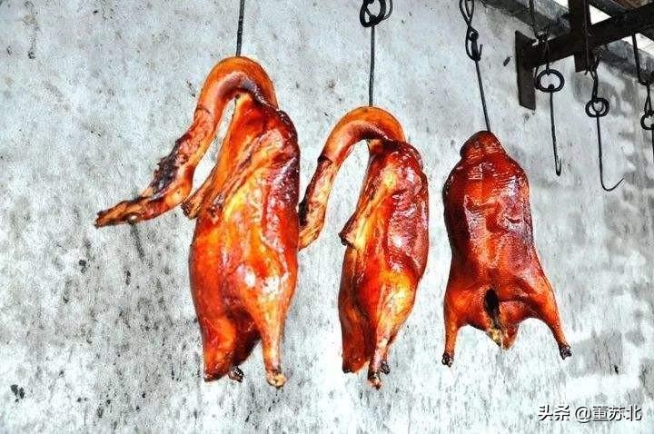 烤鸭:烤鸭名气有100多年历史。原料:活鸭一只,重2公斤以上,麻油、白糖各100克,甜酱150克。制法:鸭宰后洗净去肚杂,用铁叉将整鸭叉在木炭火上烤熟,边烤边涂麻油于鸭皮上。食用时将鸭切成小方薄片,蘸甜酱吃(甜酱用白糖制成),味鲜美可口。此艺今只有少数人能做。