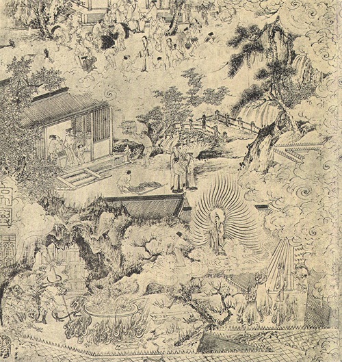 在梁楷的这一笔法运用中确实获得淋漓尽致的表现。据《绘事备考》所记,梁楷细笔画迹有《孙子八变阵图》《太乙三宫用兵阵图》《章贤十二时云气图》《明堂宗庙位次图》等,皆为待诏应制之作,这些作品由于种种原因皆湮没不存,而《黄庭经神像图卷》现在几乎成为研究梁楷细笔白描向减笔写意过程中的罕见孤本,是从工整的白描向减笔过渡的经典之作。