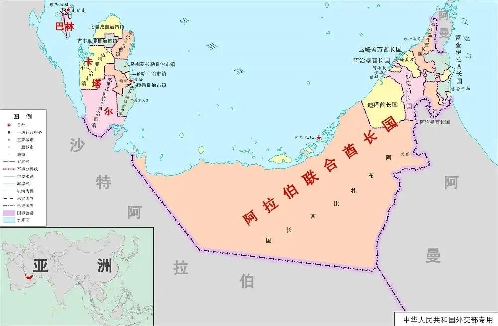 行政区划:阿联酋由7个酋长国组成,按政治影响、经济实力、人口比例排列依次为:阿布扎比、迪拜、沙迦、哈伊马角、阿治曼、富查伊拉、乌姆盖万。