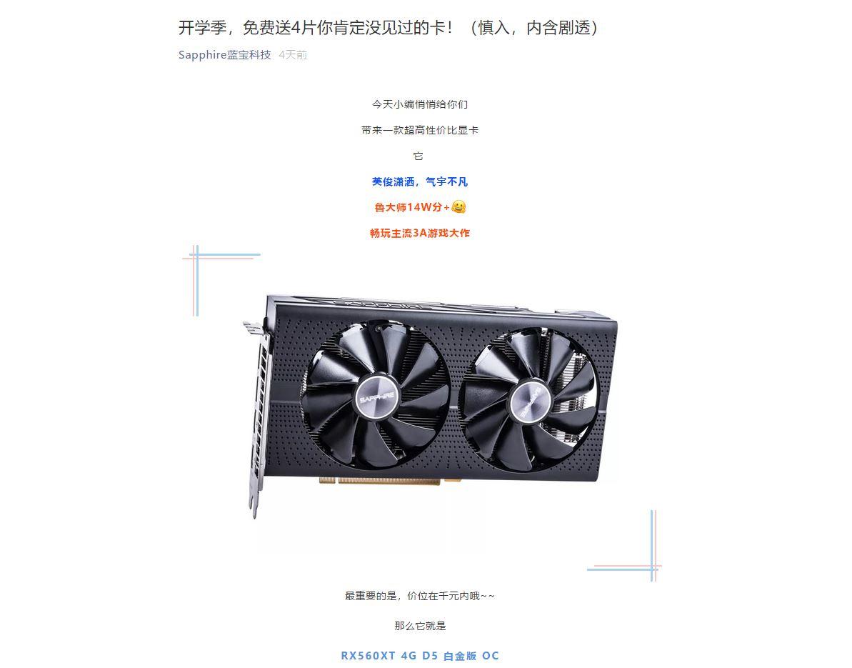 就在前几天,Sapphire蓝宝石就有公布新卡RX 560XT的消息,作为非资深A粉的硬核有幸提前拿到,既然它是千元以内的显卡,手上也有一张GTX 1050 Ti可对比再好不过了,估计这款显卡是没有公版的,这无疑是跟RX 590一般待遇,新架构还要等上一段时间呢。