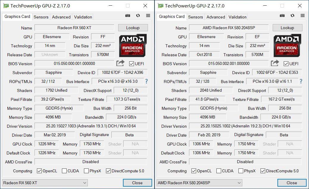 附上RX 560XT 白金版和RX 580 2048SP 白金版OC的GPU-Z图,果然前面没猜测错,核心面积是一致的,只阉割掉了一点纹理单元,光栅化单元也是一致,再看流处理器也就一定差距而且不太大,所以这货必定是RX 470 @570核心下精雕细琢的新产物,所以它就是曾经的RX 470D咯?顺便看看鸡血驱动的表现吧,NVIDIA驱动是最新的419.35 WHQL,AMD则是Adrenalin 2025 Edition 19.3.1。