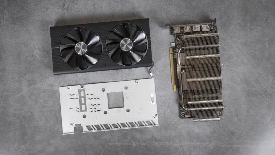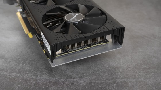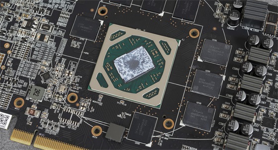 除了配有两颗大号双轴承风扇,鳍片底座是作为传到介体,分别帮助核心、显存和供电部分散热,显存和核心部分并没有做特别的分开处理,毕竟RX 560XT的定位摆在面前。