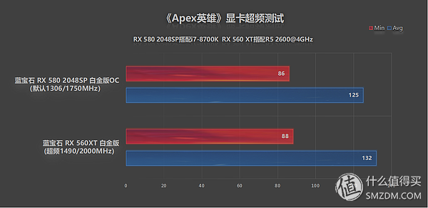 蓝宝石RX 560XT 白金版,超频核心1490Mhz@显存2000MHz,平均帧数132fps,最低帧数88fps。蓝宝石RX 580 2048SP 白金版OC默认,平均帧数125fps,最低帧数86fps。