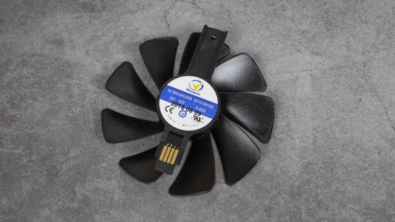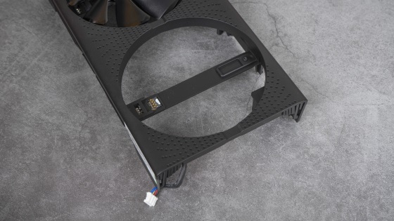 正面的导流罩是两颗95mm的双滚珠轴承风扇,这种规格同样使用在RX 580/590身上,可想而知效率之高,风扇是支持一颗螺丝快拆的,且不带线材牵连而是触点设计,具体参数可看拆解部分。