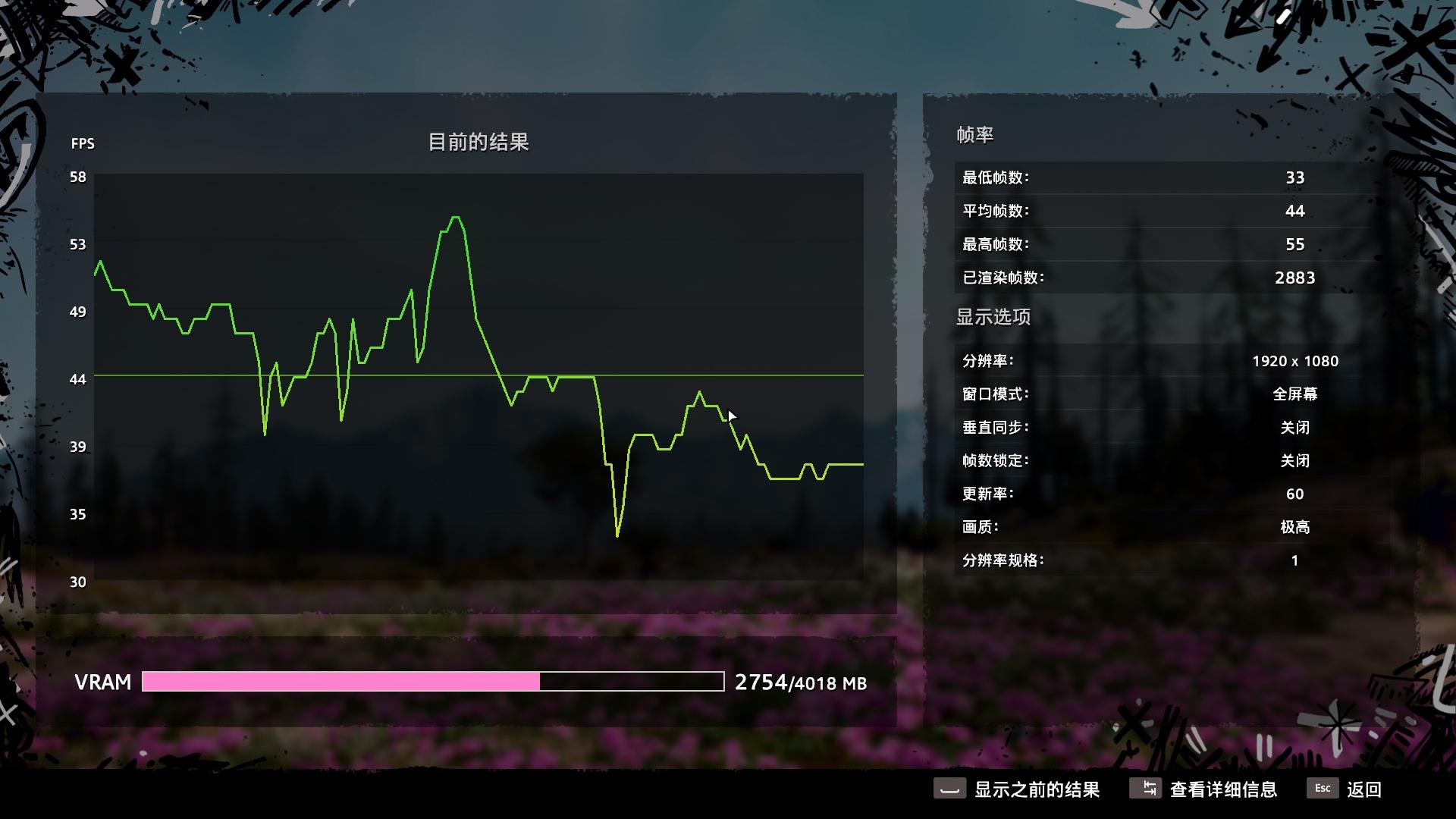 七彩虹iGAME GTX 1050 Ti 烈焰战神S平均帧数44fps,最低帧数33fps