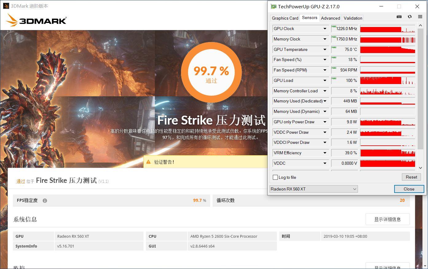 跑满载温度最佳的选择当然是3DMark压力测试,这是更接近日常负载的情况且不会碰到功耗墙,20次循环场景10分钟跑下来最终以99.7%的稳定度通过,可以说明负载时核心频率很稳定,而核心温度则是慢慢上升的,最终在最高75℃停留不动。