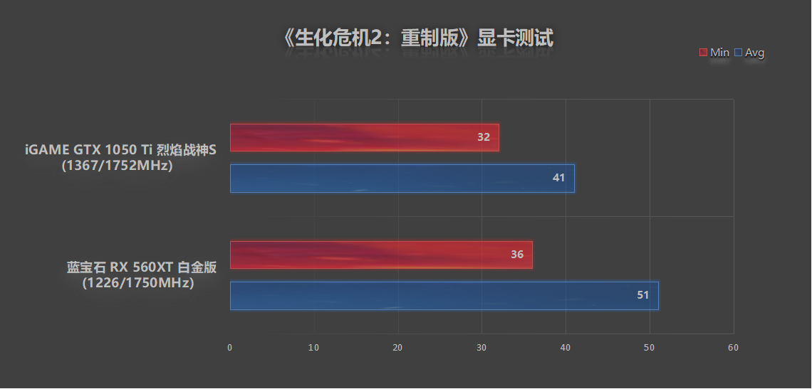 蓝宝石RX 560XT 白金版 平均帧数41fps,最低帧数32fps,七彩虹iGAME GTX 1050 Ti 烈焰战神S平均帧数51fps,最低帧数36fps。
