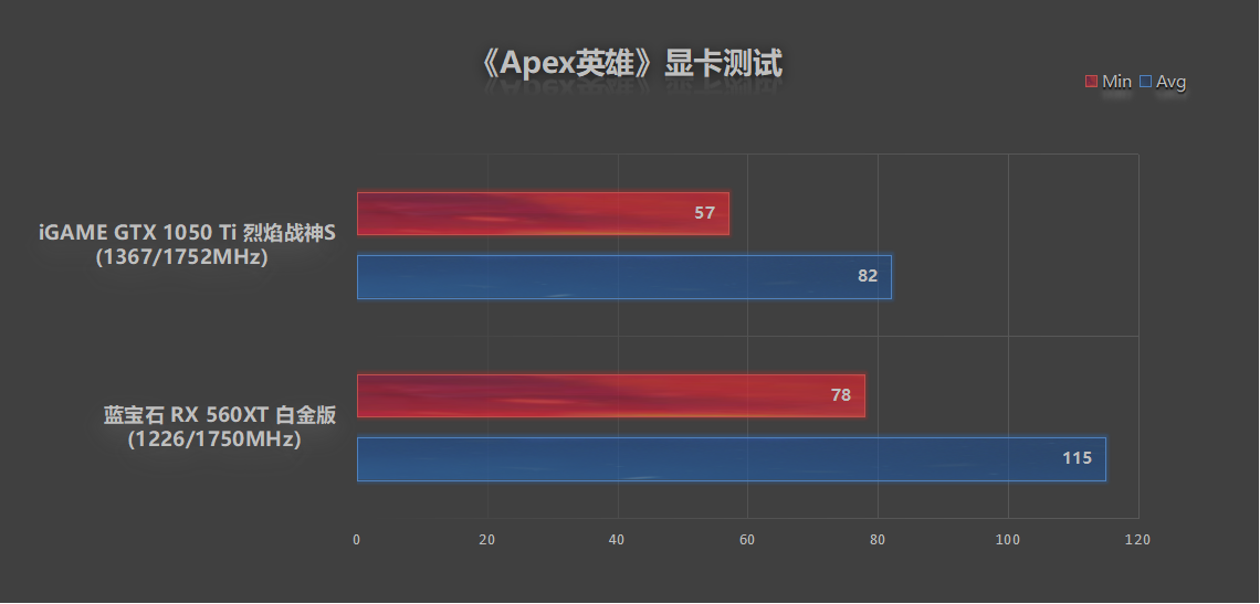 蓝宝石RX 560XT 白金版 平均帧数115fps,最低帧数78fps,七彩虹iGAME GTX 1050 Ti 烈焰战神S平均帧数82fps,最低帧数57fps。