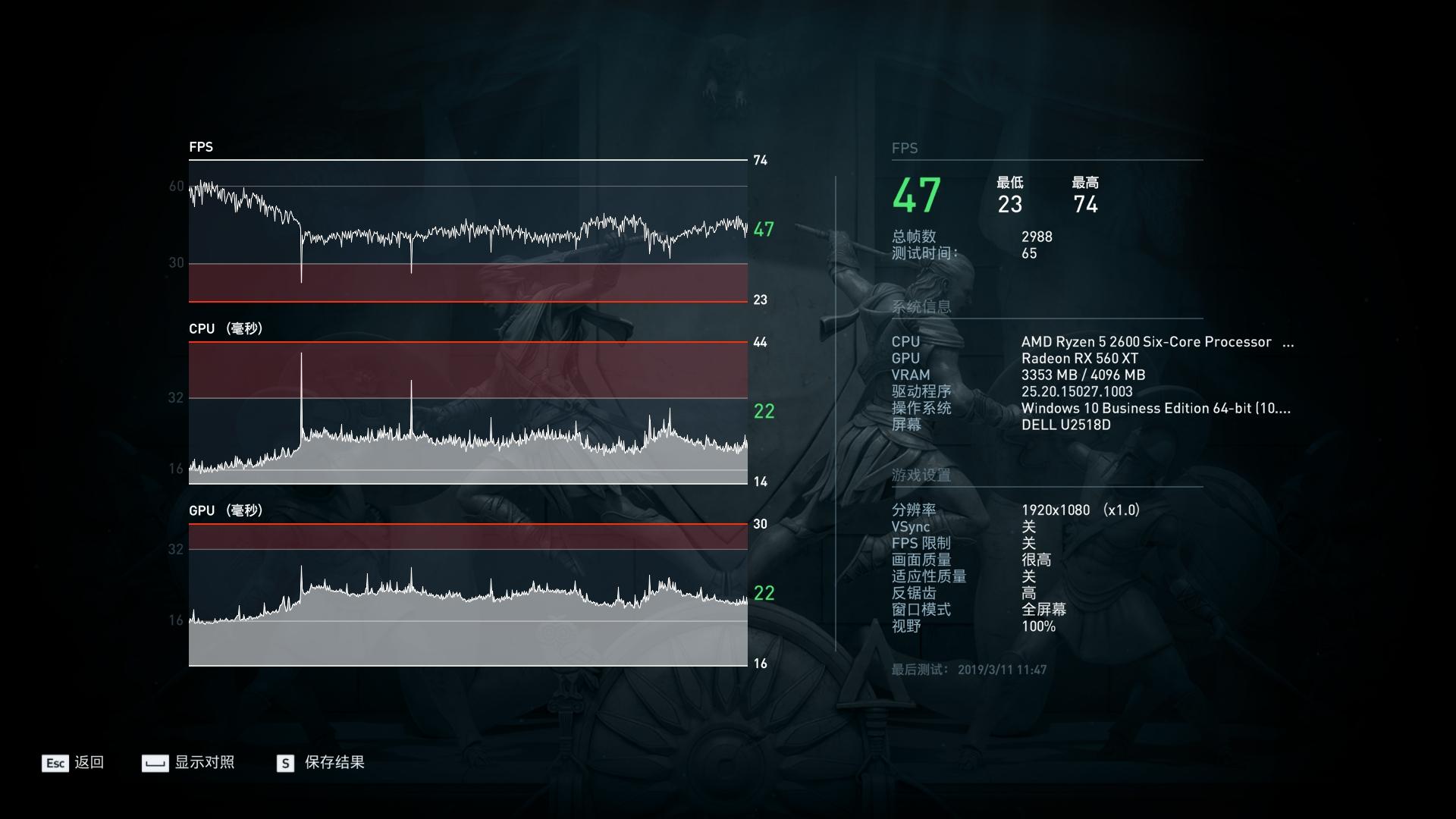 蓝宝石RX 560XT 白金版,超频核心1490Mhz@显存2000MHz,平均帧数47fps。