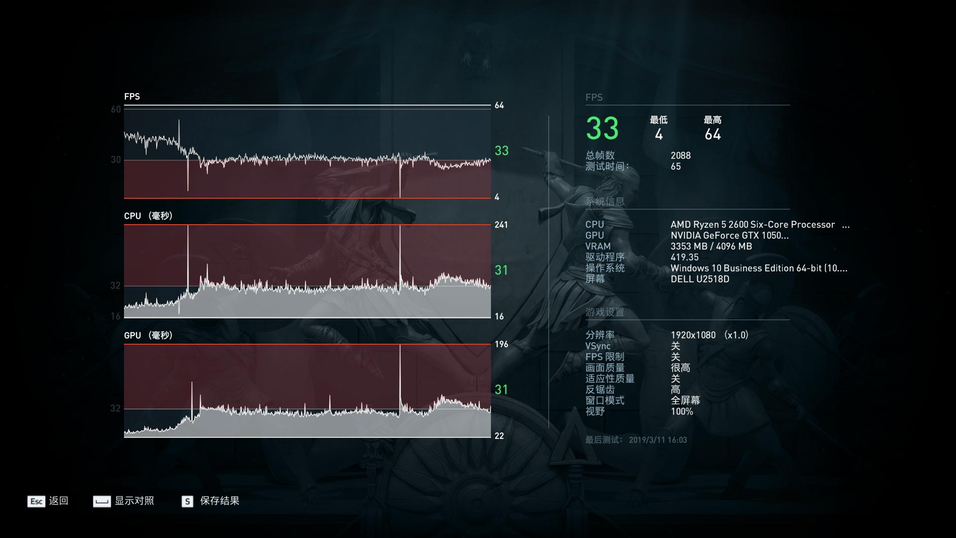 七彩虹iGAME GTX 1050 Ti 烈焰战神S平均帧数33fps,最低帧数是不太准确的,仅仅看平均就好