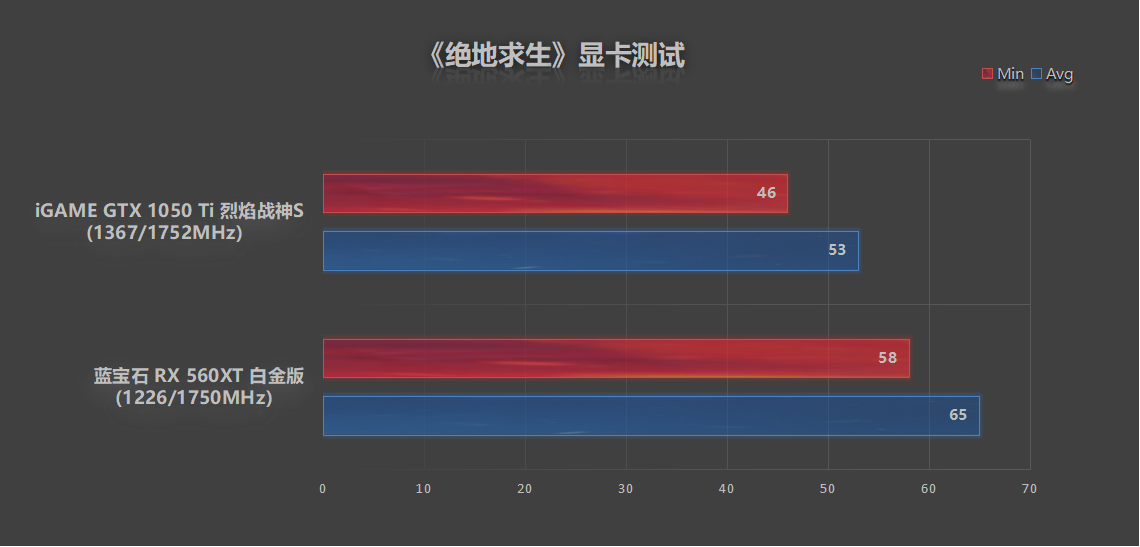 蓝宝石RX 560XT 白金版 平均帧数65fps,最低帧数58fps,七彩虹iGAME GTX 1050 Ti 烈焰战神S平均帧数53fps,最低帧数46fps。