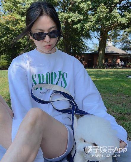 这不,工作刚一结束,马上就恢复了休闲状态,带宠物狗狗到公园去放松。