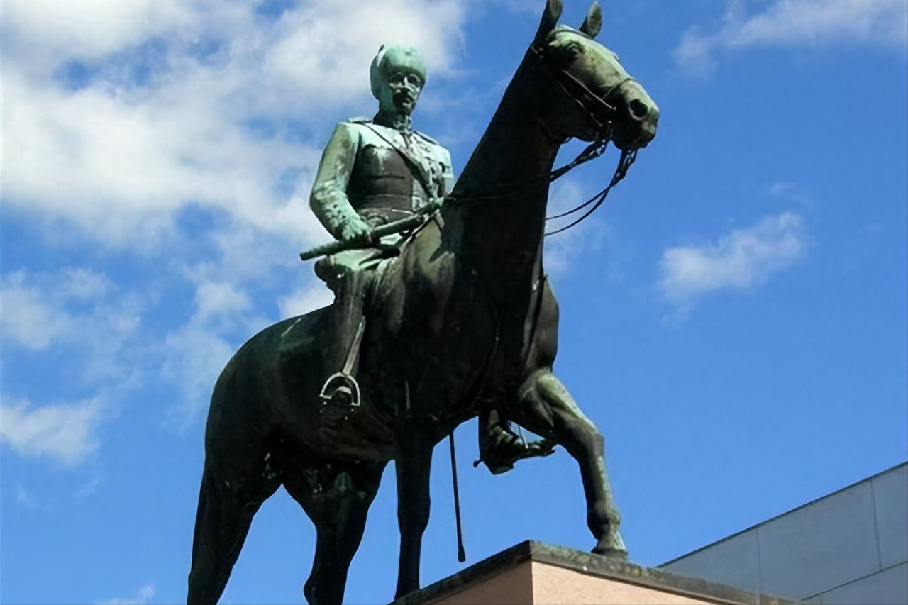 铜像中的曼纳海姆一身戎装骑着骏马,目光坚毅地平视前方,马后挂着一把长剑。