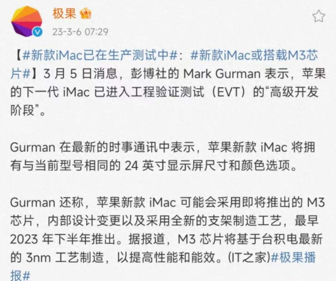 此前彭博社曾报道,代号为J433和J434的新款iMac已经进入工程验证测试(EVT)阶段,也就是后期收尾阶段,接下来就是上市发布。