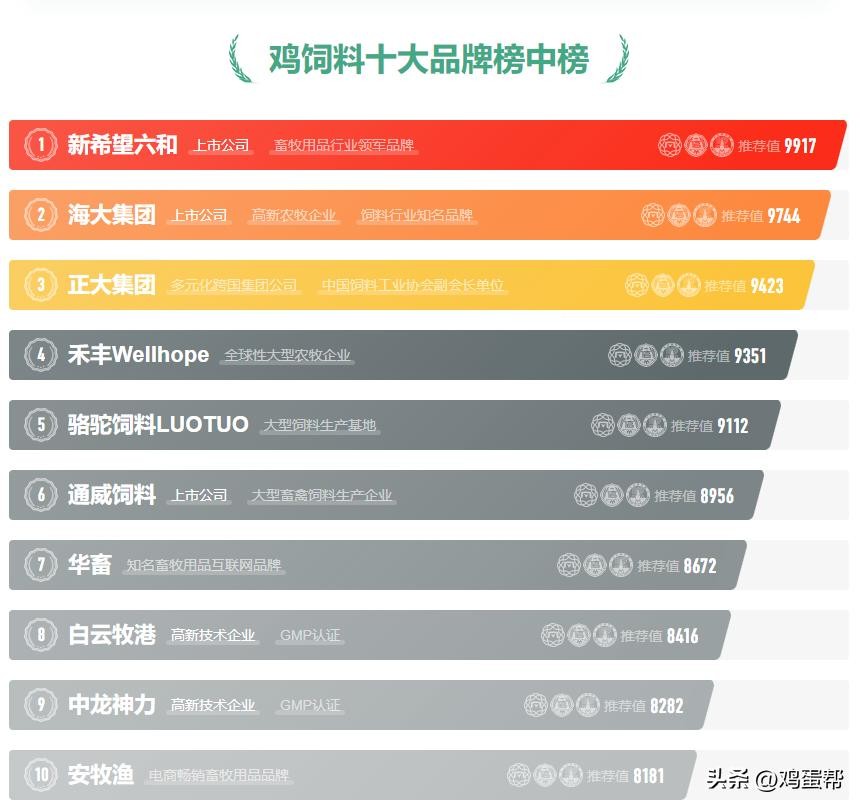 本榜单根据市场参数条件变化研究出2023年十大鸡饲料品牌排行榜,鸡饲料排行榜前十名分别为新希望六和、海大集团、正大集团、禾丰、骆驼饲料LUOTUO、通威饲料、华畜、白云牧港、中龙神力、安牧渔。