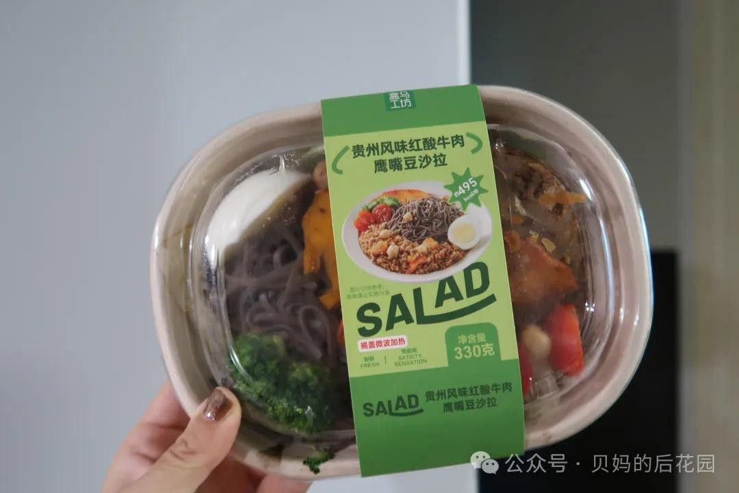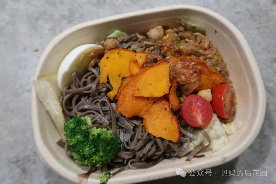 主食以荞麦面为主,配菜有番茄,西兰花,球生菜,南瓜片,鹰嘴豆,以及特色贵红酸牛肉粒酱。典型的中式沙拉。主打贵州酸辣风味走一个。