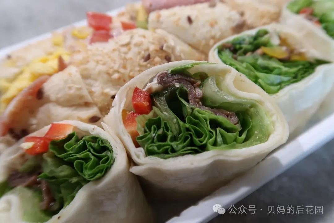 蔬菜牛肉卷,面皮薄软,卷着生菜,番茄,甜椒,培根,薄牛肉等。卷的大小,刚好一口一个,不易漏馅,满嘴清爽!