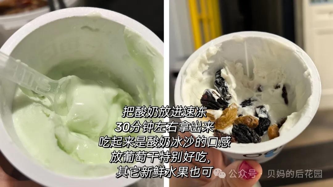 既然说了这么多,再贡献一个最近超爱的自制美味『冰沙酸奶』的傻瓜大法。那就是,酸奶连盒一起放进速冻,冻一会儿,拿出来,即可收获一杯酸奶冰沙。还可以加入葡萄干或新鲜水果之豪华版,无敌好吃!