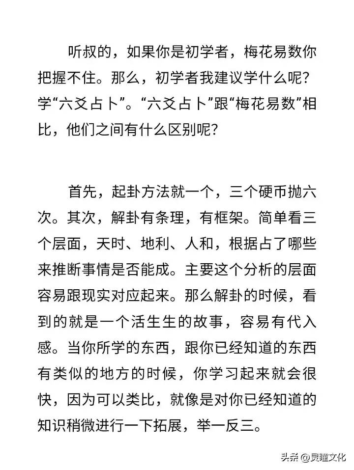 作者说梅花易数是不建议初学者先接触的,而六爻占卜是建议初学者学习的,因为梅花易数太灵活多变,而六爻占卜有条理有框架,更容易学习和应用。