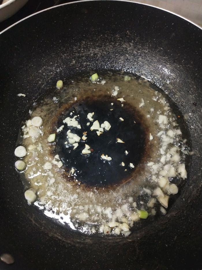 步骤3、起锅烧油,放入少许食用油烧热,将生蒜切碎放入锅中,小火炒出香味,蒜末变焦黄即可。