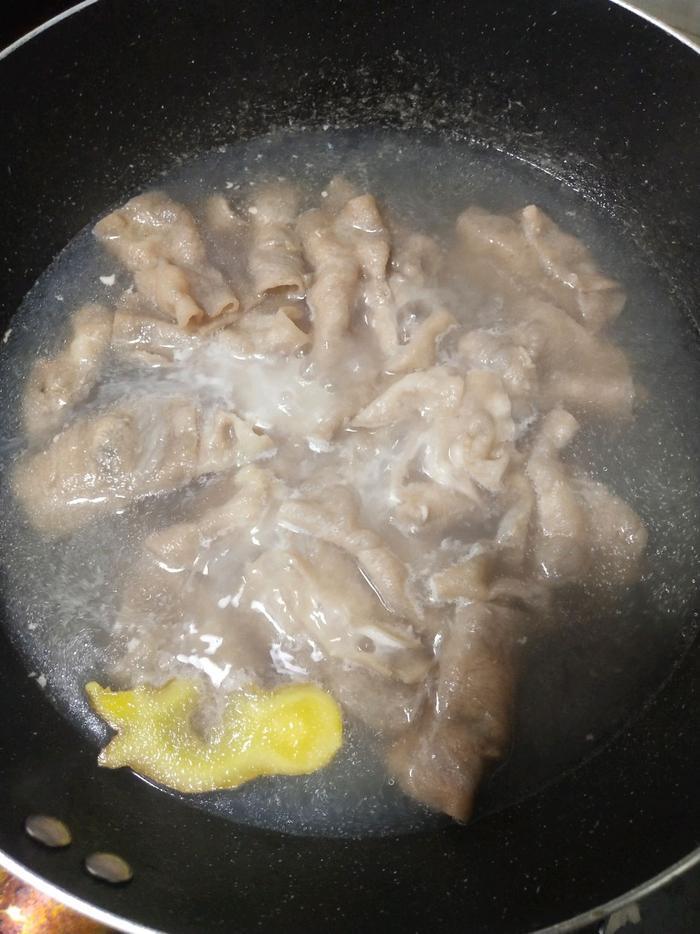 步骤2、随后起锅烧水,放入肥牛肉片,焯一下,再放入两片生姜,水开后肥牛变色,捞出洗净。