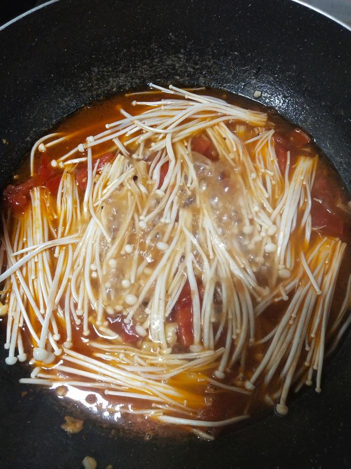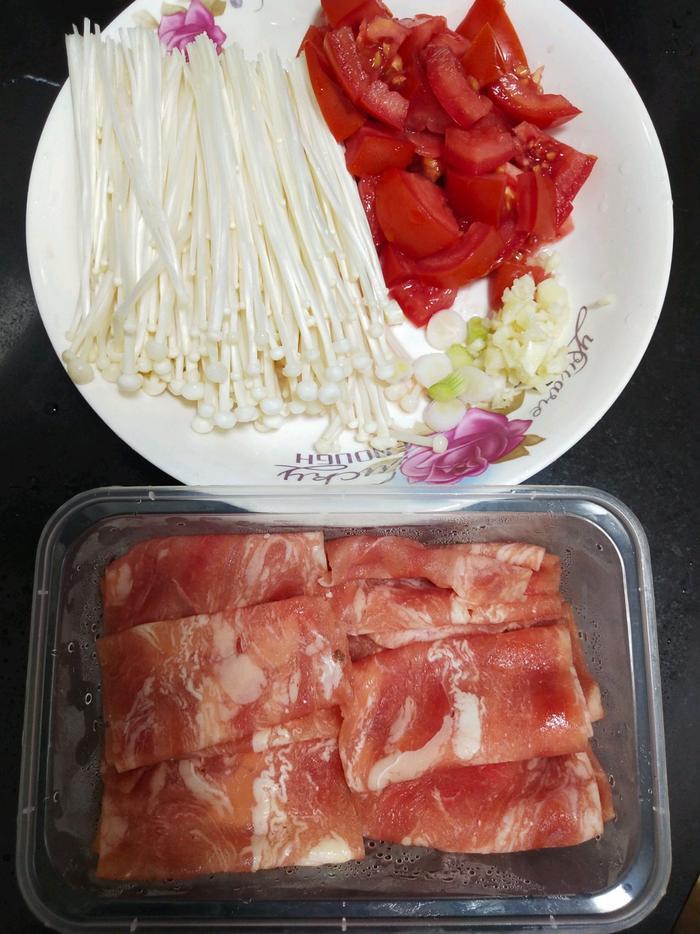 【烹饪食材】:番茄3个、肥牛300g、金针菇一把、生蒜2瓣、小葱1根、番茄酱1勺、胡椒粉1勺、蚝油1勺、盐5g