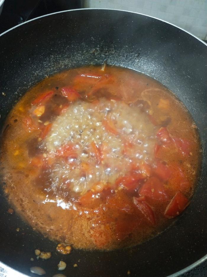 步骤4、放入番茄丁不断翻炒出汤汁,记得全程开小火,以免干锅,出汤汁后放入适量的清水一同煮开。