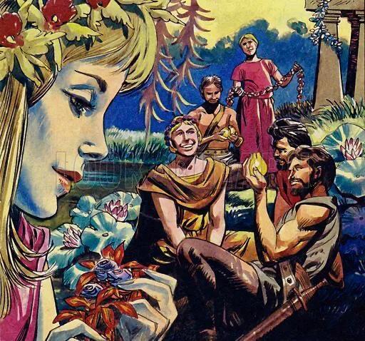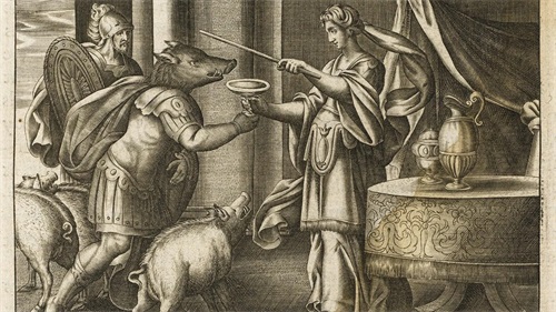 在食人的拉斯特里贡人摧毁了他所有的船只,只剩下他自己的船之后,他继续航行,到达了埃厄厄亚岛,那是女巫女神喀耳刻的家。她用下药的奶酪和酒把他一半的男人变成了猪。赫尔墨斯警告奥德修斯提防喀耳刻,并给了奥德修斯一种叫做魔力的草药,使他抵抗喀耳刻的魔法。奥德修斯强迫喀耳刻把他的手下变回人形,并被她引诱了。