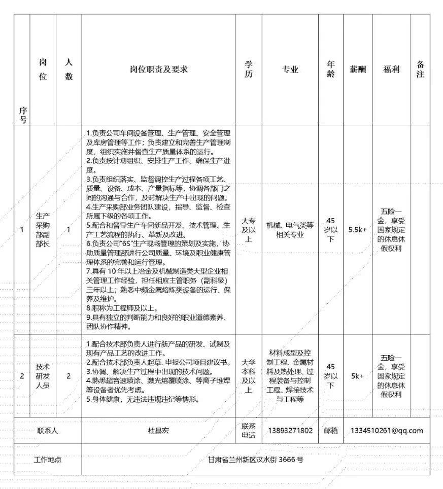 兰州理工合金粉末有限责任公司始建于1992年,2002年随甘肃工业大学更名为兰州理工大学合金粉末厂,2010年改制为职工参股的有限责任公司,2019整体划归甘肃电气装备集团有限公司管理。现资产规模8900万元,职工76人,下设粉末车间和表面车间,主要从事镍基、钴基、铁基等合金粉末及增材制造业务的研发、制造和销售,拥有甘肃省金属粉体材料行业技术中心,系西北地区唯一的集合金粉末制造、表面工程技术应用一体化的高新技术企业。现向社会招聘优秀人才,热忱欢迎有志之士加盟合金粉末公司,携手同行,共创未来。