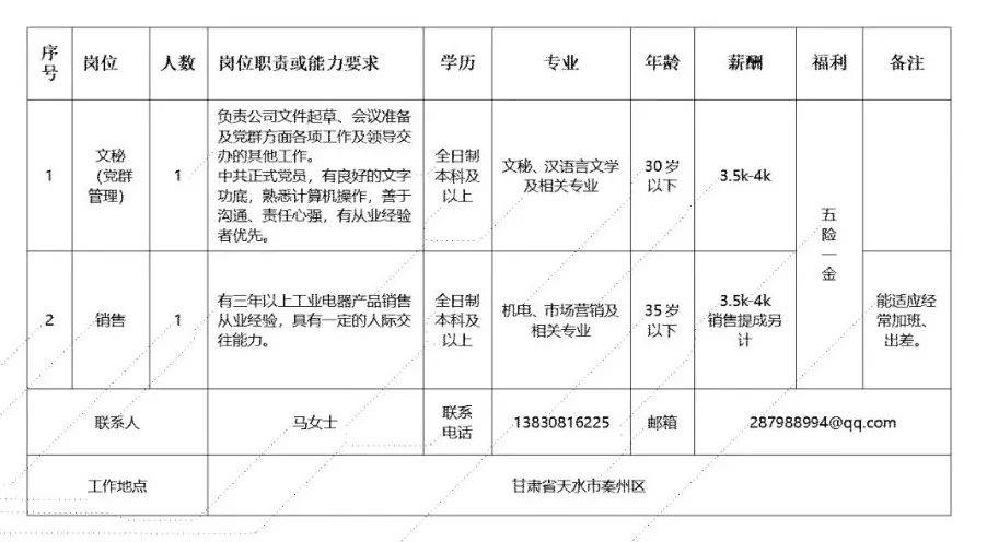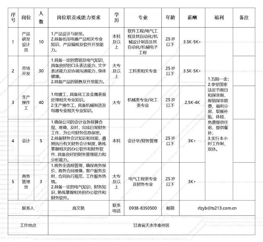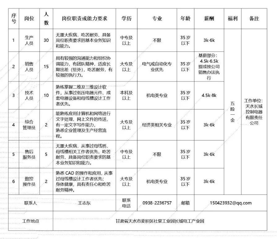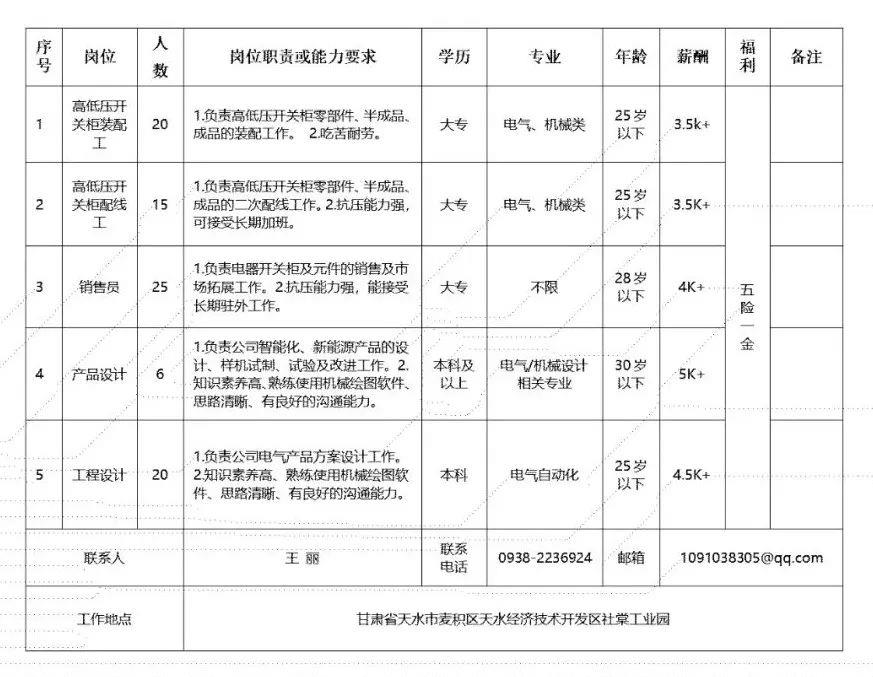 (五)国有企业、行政事业单位的干部按照《甘肃电气装备集团有限公司员工调动管理办法(试行)》可办理正常调动手续,按相应职级、级别享受工资薪酬待遇;其他人员一经聘用,与招聘主体单位签订劳动合同,办理社会保险。