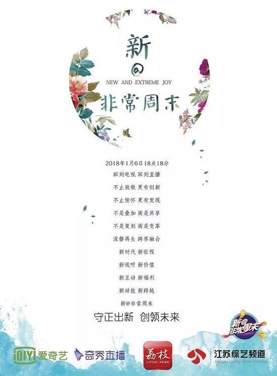 2018年1月6日晚18点18分,江苏综艺频道多媒体直播互动新形态栏目平台《新@非常周末》全新开播。黄金五小时非常大直播,全主持阵容隆重出击,电视与手机双屏互动,直播加送奖狂欢不停。江苏综艺频道、江苏网络电视台、荔枝新闻客户端、爱奇艺奇秀直播同步播出,五小时人气不断攀升;奇秀直播、荔枝网、综艺频道官微三路齐发,互动数字频频刷新。截止1月6日23点整,《新@非常周末》首期节目网络累计互动数字突破181万。守正出新,创领未来。《新@非常周末》以优异的成绩开启电视直播互动新时代。