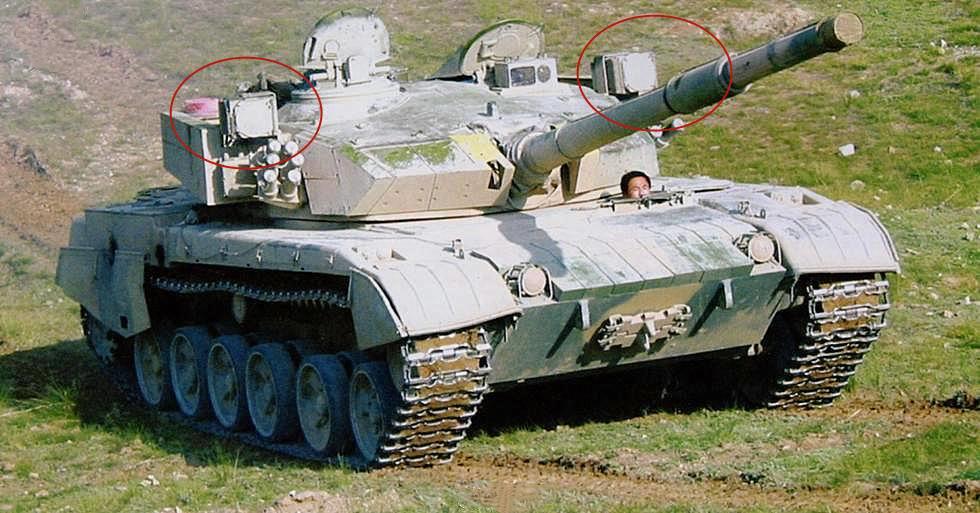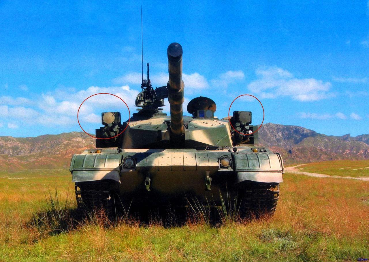 你没看错,96A在研发时,是安装有主动防御系统,不过是软杀伤的那种,也被叫做光电干扰系统,具体型号为TCS-2型光电干扰系统。整个系统由两台“高精确传感器”,两台“低精度传感器”,和一对“光电干扰仪”组成。