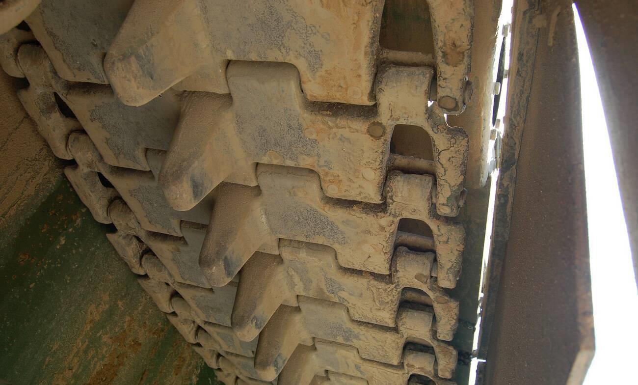 96A的双销挂胶履带,右边是侧裙板,厚材质为橡胶加钢丝
