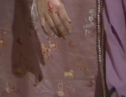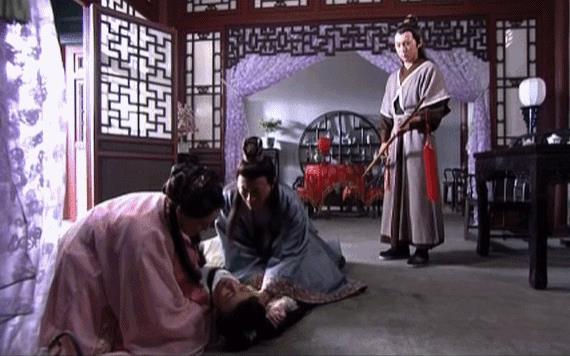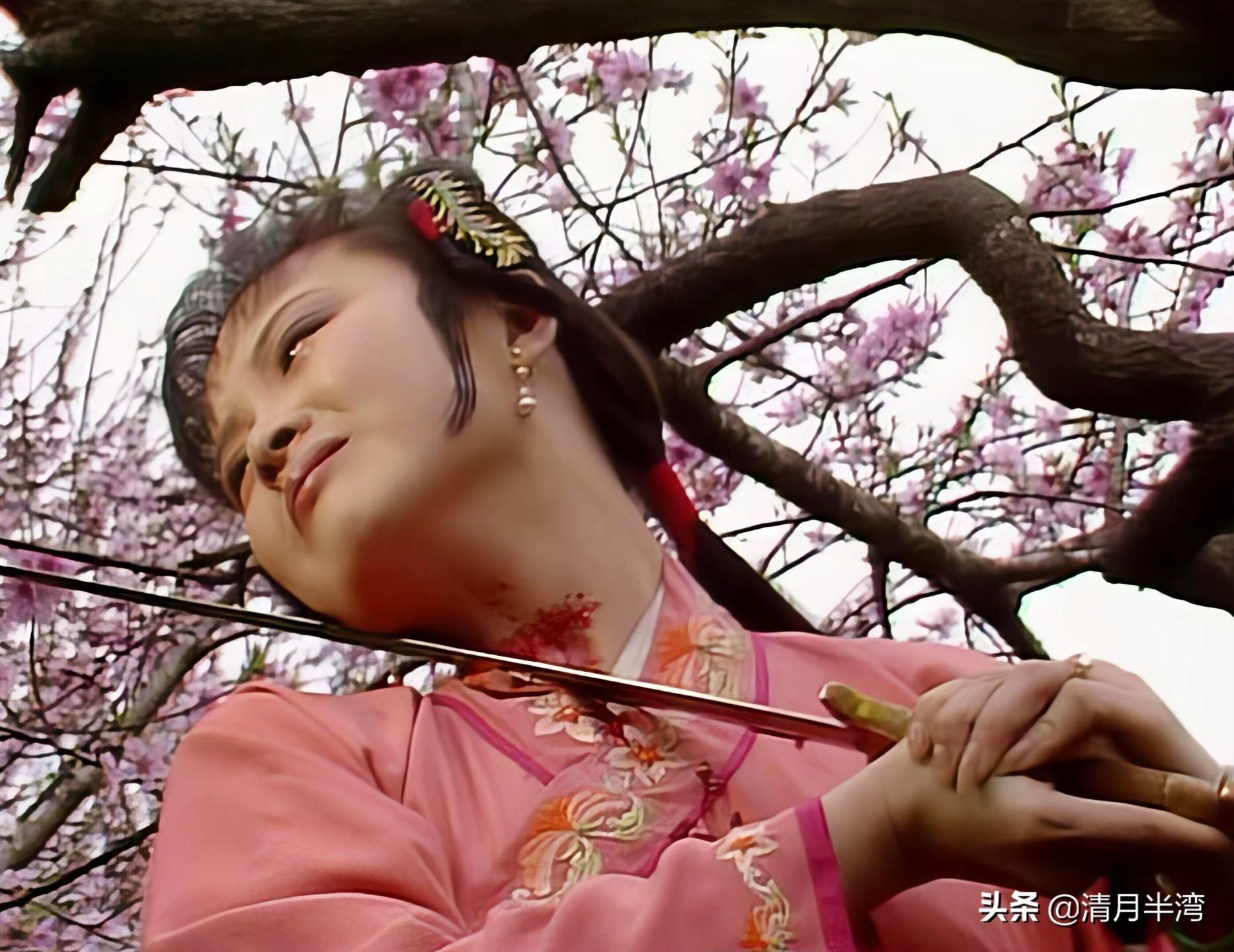 再说尤三姐自杀这段戏,原著中是尤三姐只用雌剑往项上一横自刎而亡,这版不讲究细节,直接让尤三姐把两把剑都拔了出来,一同往脖子上抹。