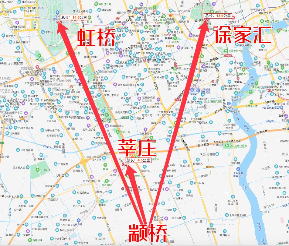 上文也说到,颛桥被众多强势板块包围,从地段上来说,颛桥距离虹桥和徐家汇两大都心板块,直线距离都在约14km左右,距离莘庄板块中心直线距离约4.5km左右