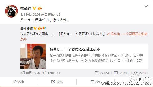 2016年8月10日,《杨永信,一个恶魔还在逍遥法外》被林熊猫(林琪雪)微博转发,并迅速推广。