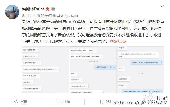 2016年8月11日,雷斯林声称自己“采访”了两个曾经在网戒中心住过的网友。
