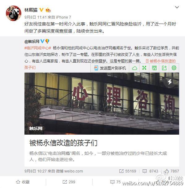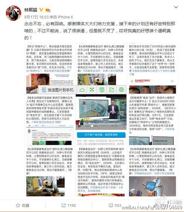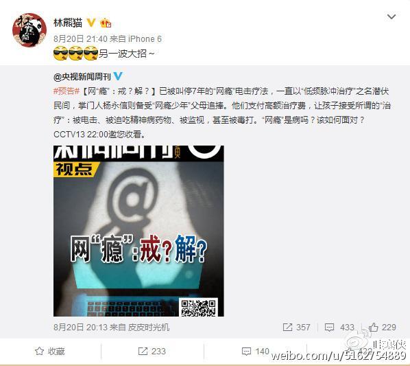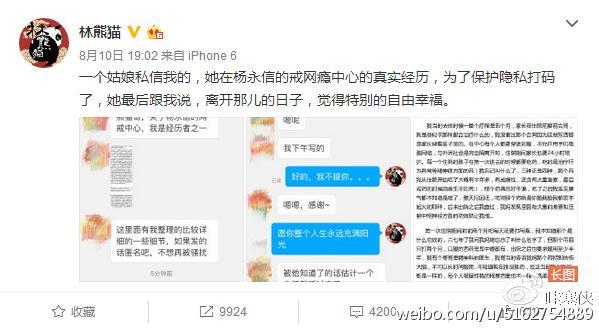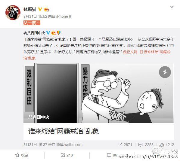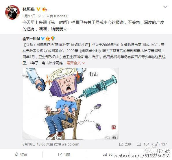 2016年8月17日,林熊猫在微博上发表了“今天早上央视《第一时间》栏目已有关于网戒中心的报道,不着急,深度的广度的还有,嘿嘿,咱慢慢来~”的言论。