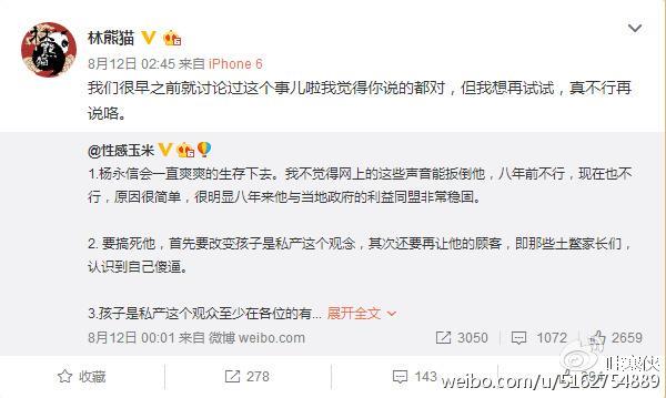 2016年8月20日,林熊猫发表“另一波大招~”的言论。