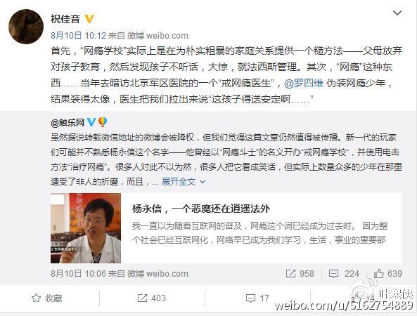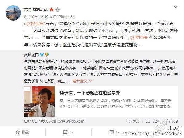 说白了,他们要攻击的对象不是杨永信,也不是临沂网戒中心,而是所有支持“网瘾论”的人,杨永信不过是一个代表罢了。