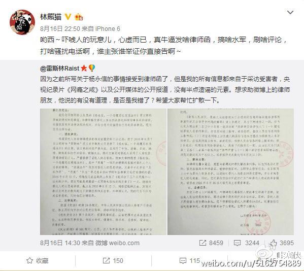 2016年8月16日,林熊猫在微博上转发了蔡江舟收到的律师函,表示力挺蔡江舟。