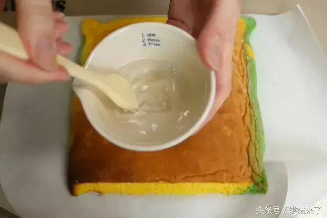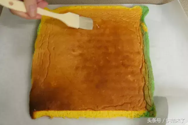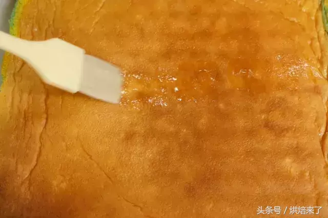 蛋糕胚带皮的一面均匀地刷上一层保湿糖浆。(也可将表皮搓掉后再刷)