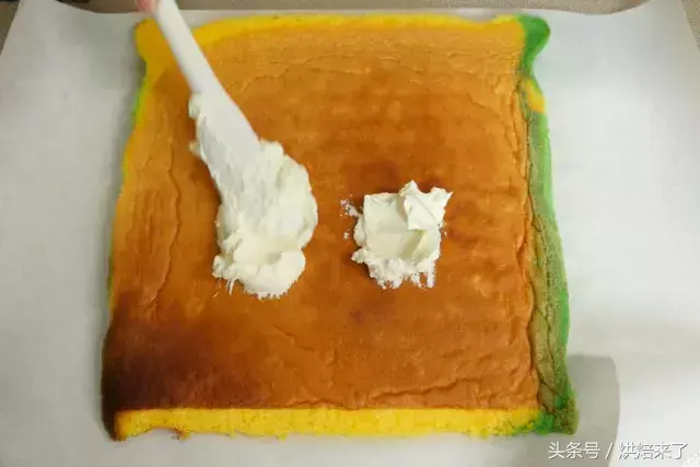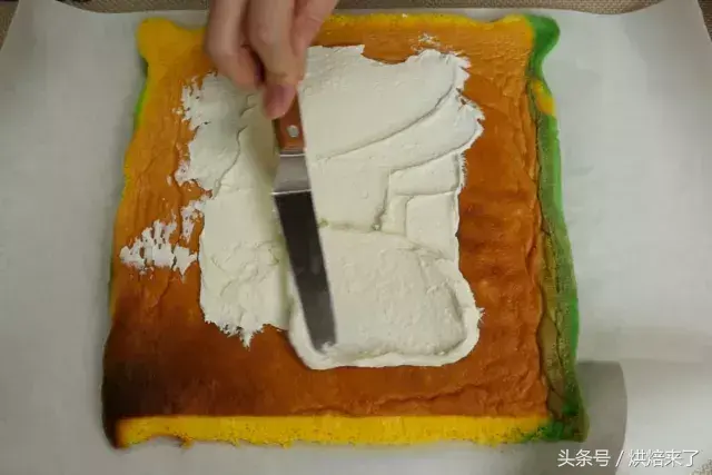 刷完糖浆后,均匀抹上一层打发的淡奶油。尾端留出一小截不抹。