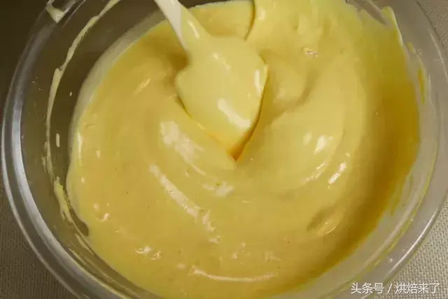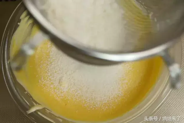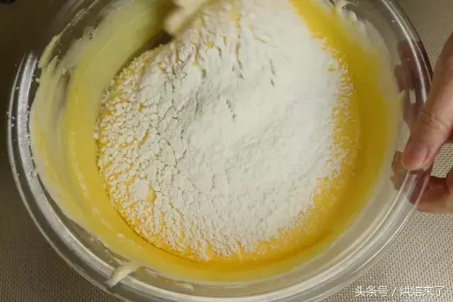 黄色色浆料中筛入45g低筋面粉②拌匀。