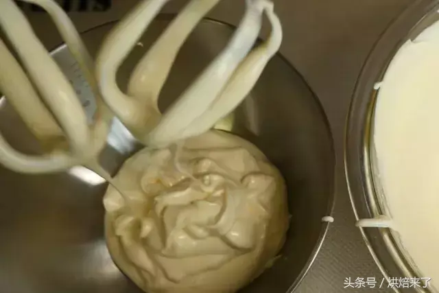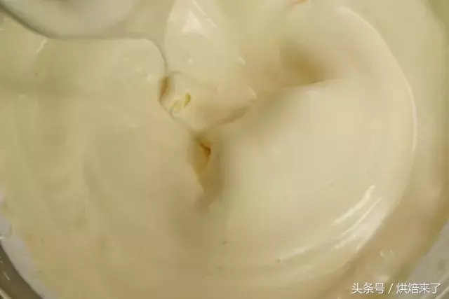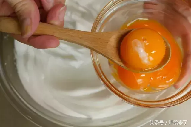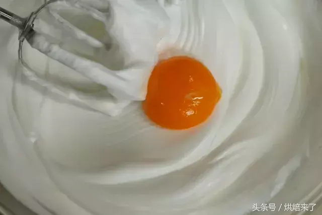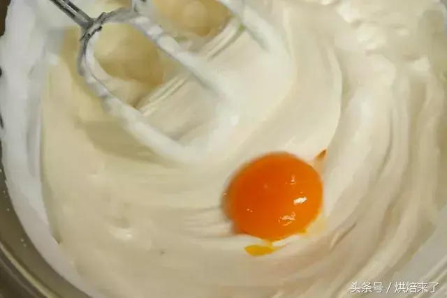 打发的蛋清中分次加入蛋黄中慢速打发拌匀。