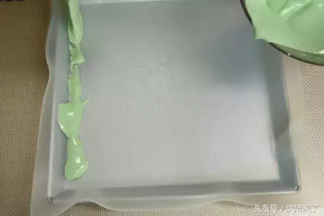将拌匀的绿色浆料均匀的倒在烤盘两头,一头多一些,一头少一些。