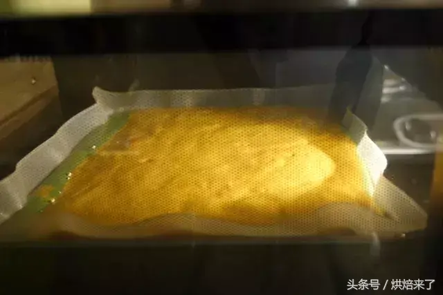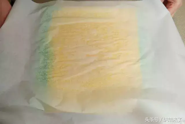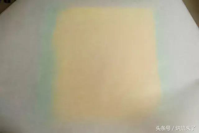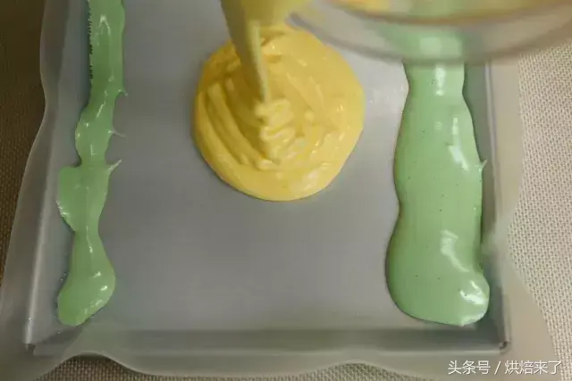 接着倒入黄色浆料至烤盘中间,轻震烤盘消泡,并将浆料震平。