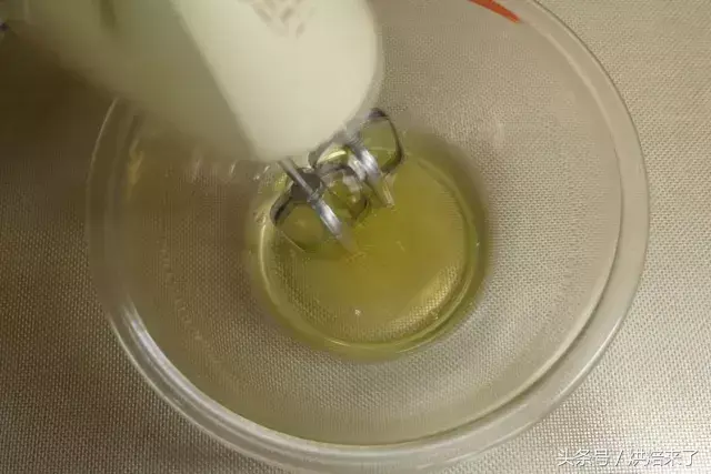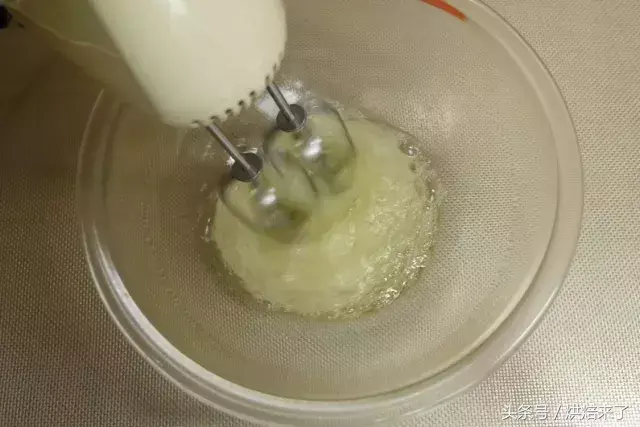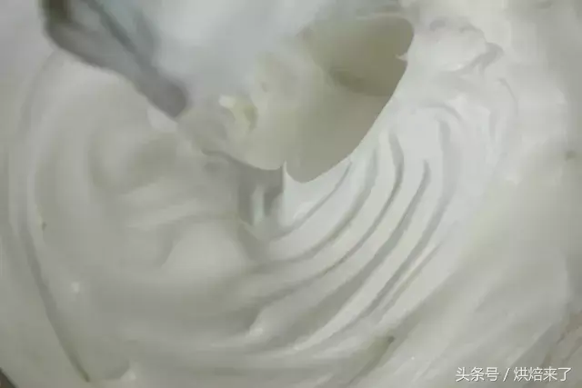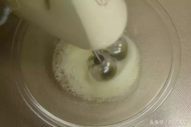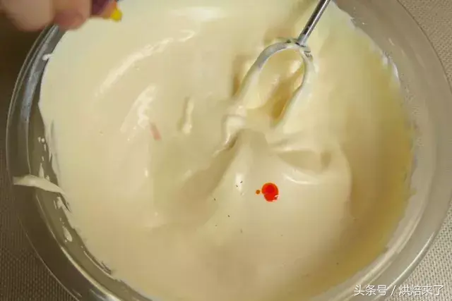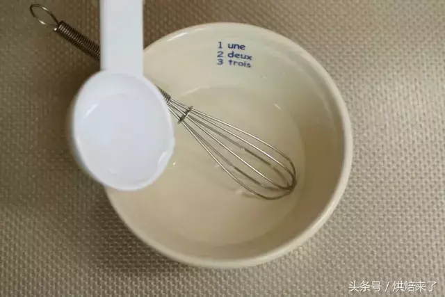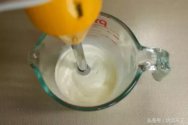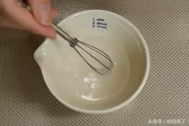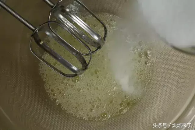 蛋清放入干净无油无水的容器中,用打蛋器打至鱼眼泡状时,加入幼砂糖①打发至8成尖角直立状。