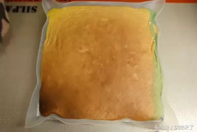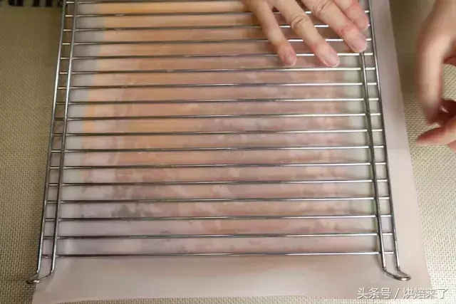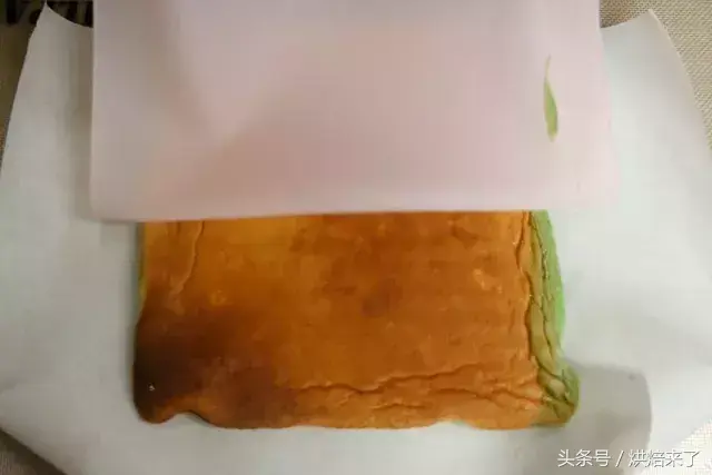 出炉后的蛋糕胚利用晾板倒置,将硅胶垫替换成干净的烘焙纸,为了防止收缩,表面也盖上一层干净的烘焙纸。