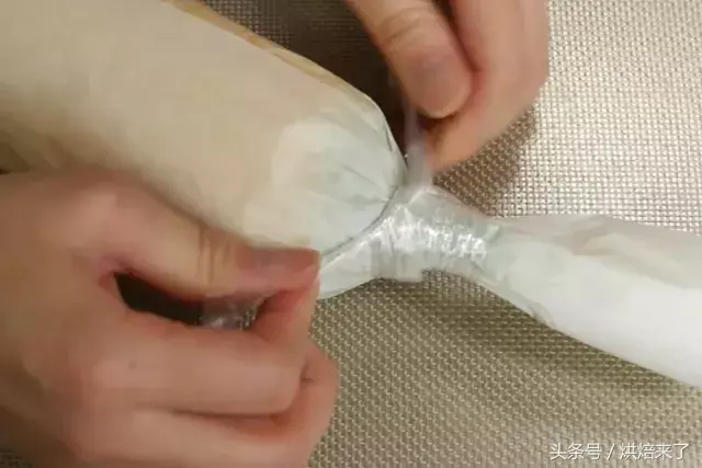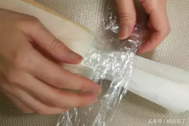 再用保鲜膜包一层,并将另一端也系紧,稍作弯曲状,用一个四方形状的东西卡住蒂把一端定型,并把保鲜膜头尾相连系住。